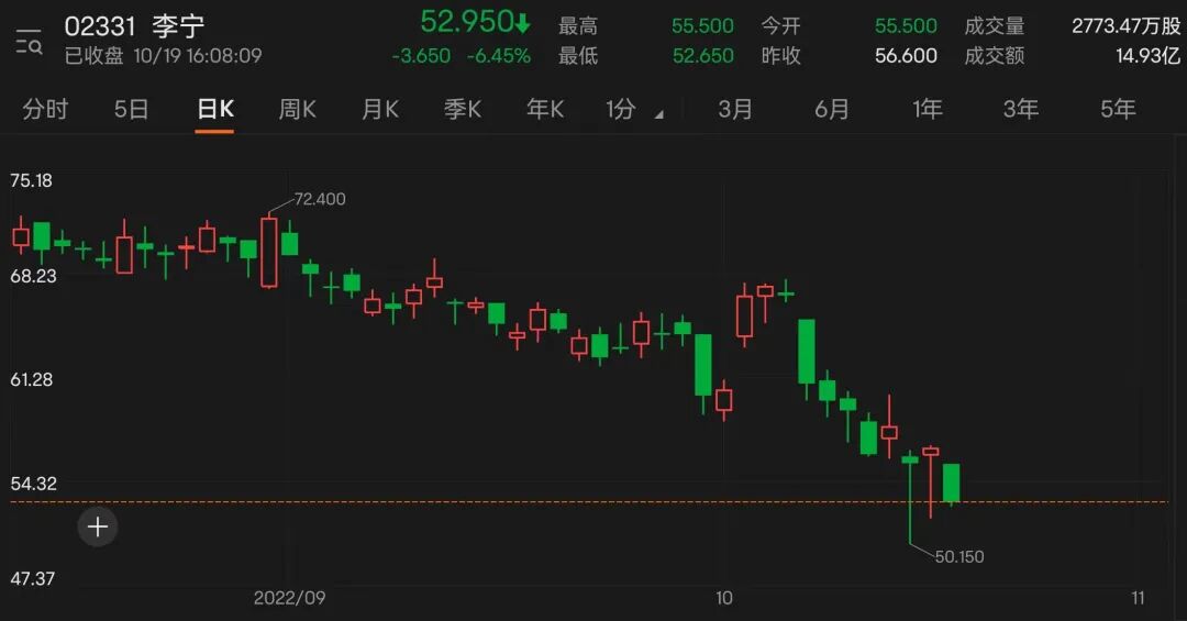 资本市场最先嗅到了李宁的这次品牌危机,10月14日,李宁(HK02331)的收盘价还是59.3港元,10月17日一早即下跌13%,但随后收复大部跌幅。