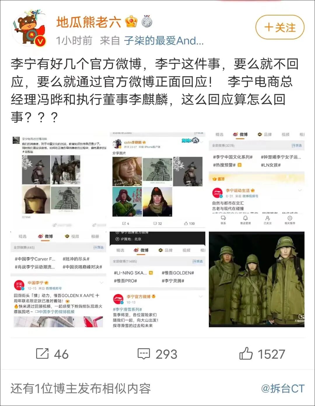 10月17日以来,一个关于“李宁新品被指酷似侵华日军服装”的话题在网上发酵,据百度搜索不完全统计,截止19日15时,话题阅读量超过1891万次,网友参与讨论超过11万人次。