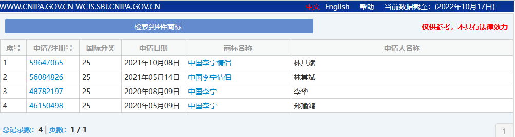 观察者网查询国家知识产权局网站发现,“中国李宁”、“中国李宁情侣”却被人尝试注册为商标,但均已遭驳回。