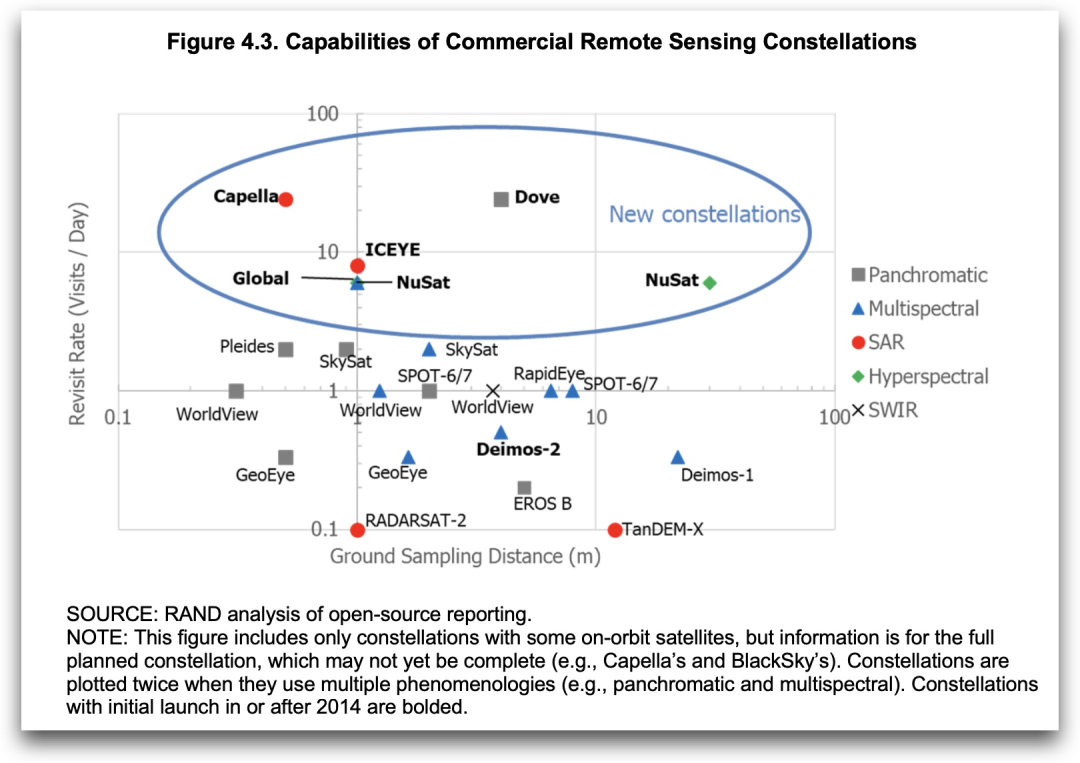 商业天基遥感市场的新进入者一直在推动能力的变化。图 4.3 显示了当前商业遥感星座的重访率(即时间分辨率)、地面采样距离(即空间分辨率)。该图显示了完整计划星座的信息,这些信息可能不完整(如 Capella 和 BlackSky )。