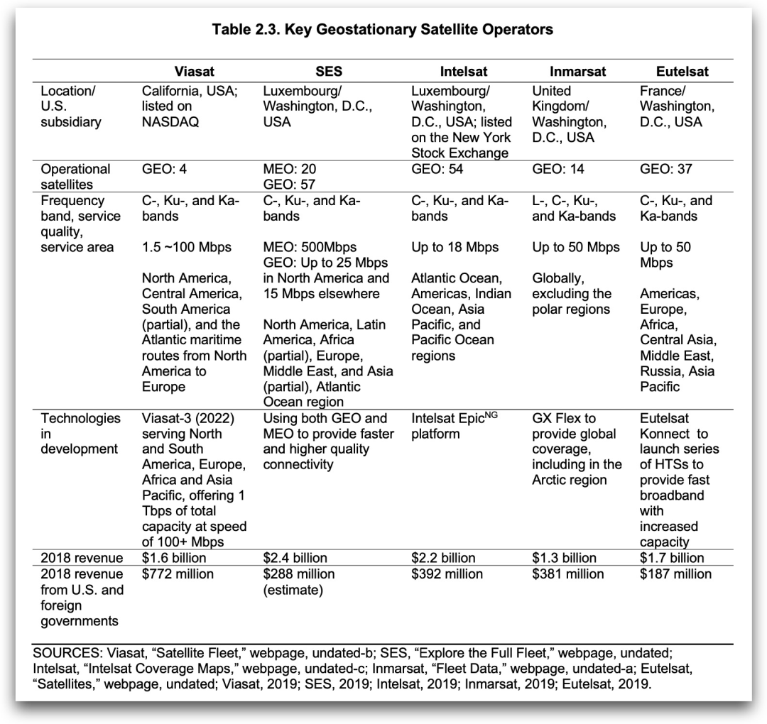 Viasat、SES、Intelsat、Inmarsat 和 Eutelsat 是 GSO 市场上与美国政府签订合同的五家主要公司。这些公司的卫星主要在 C 波段、Ku 波段和 Ka 波段运营,这是一个适合高速数据通信的频段。尽管五家公司中有四家总部位于欧洲,如表 2.3 所示,但所有公司都在美国设有子公司。一些公司为美国政府商业部门设立了独立的董事会,与欧洲母公司有一定程度的自主权。这些公司共同在全球范围内提供服务,极地地区除外。他们的大部分能力集中在北美、南美、欧洲、中东和非洲,为固定用户和越来越多的移动用户提供服务,包括空中和海上连接。