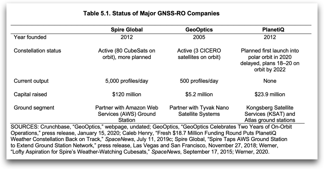 PlanetiQ、GeoOptics 和 Spire Global 在 GNSS-RO 能力方面取得了最大的发展,后两个公司已经发射了产生无线电掩星探测的卫星。所有这些都主要以 NOAA 和 DoD 为主要租户。