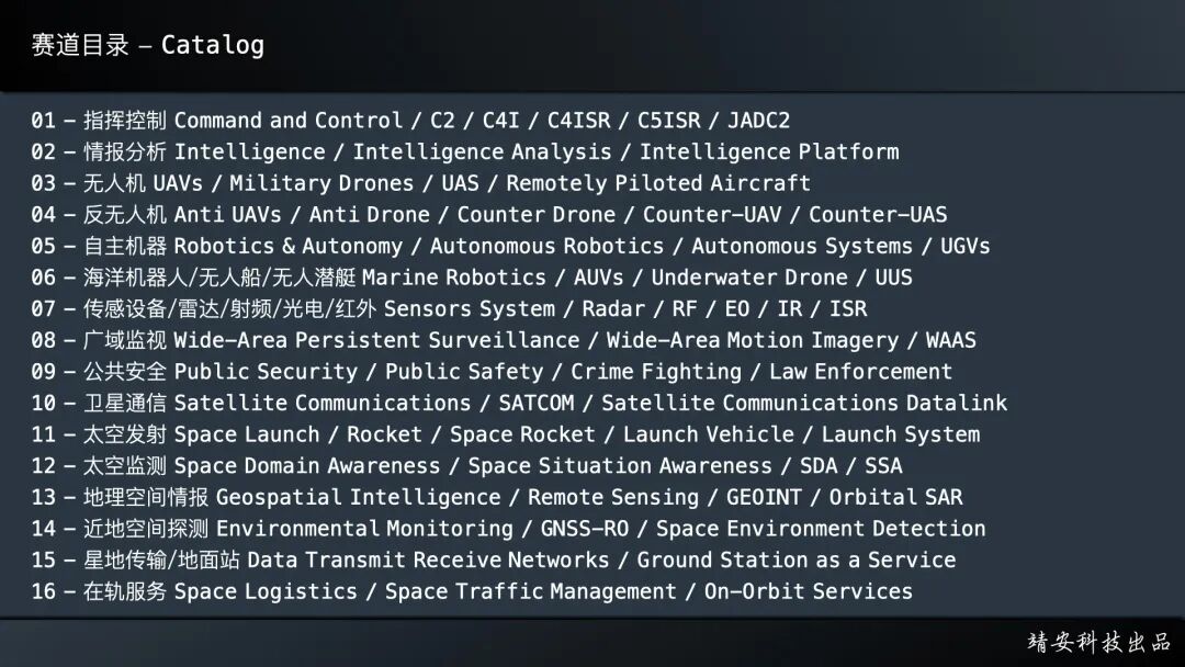 注:本次报告收录范围,指挥控制、情报分析、无人机、反无人机、自主机器、海洋机器人/无人船/无人潜艇、传感设备/雷达/射频/光电/红外、广域监视、公共安全、卫星通信、太空发射、太空监测、地理空间情报、近地空间探测、星地传输/地面站、在轨服务,如有遗漏欢迎留言补充。