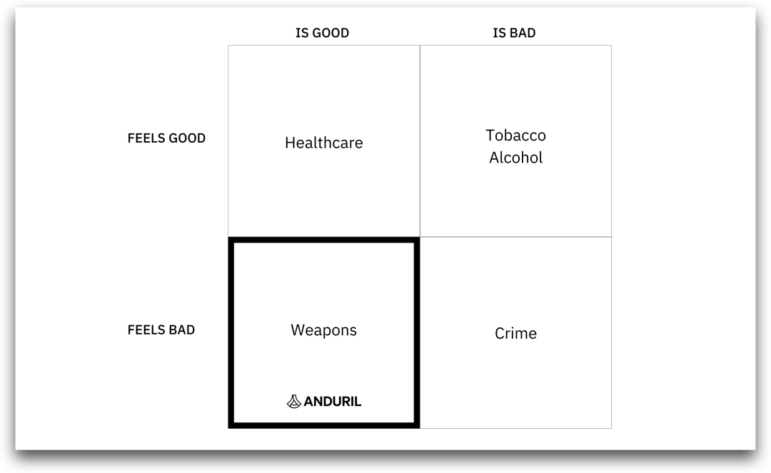 正如 Anduril 联合创始人兼执行主席 Stephens 所阐述的那样,你可以把企业所从事的业务想象成一个二乘二的矩阵象限。有些事物本身内在是好的,同时表面上也能让人感觉很好(如医疗保健),有些事物内在是坏的,但表面上却会让人感觉很好(如烟草),而有些事物则是无论内在还是表面都是坏的(如犯罪)。