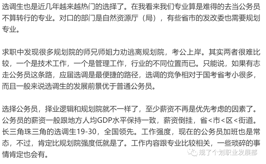 根据我的理解,规划就业,完全对口是规划院、政府;半转行有地产、平台公司、对规划有需求的其他设计院、城市数据分析公司等;完全转行方向就很多了,有人去互联网公司做产品经理,有人转金融、咨询,也有人自主创业。据我观察,规划院仍然是主流,近几年考选调的人有增加趋势,地产受就业大环境的影响比较大(据说今年竞争就十分激烈)。