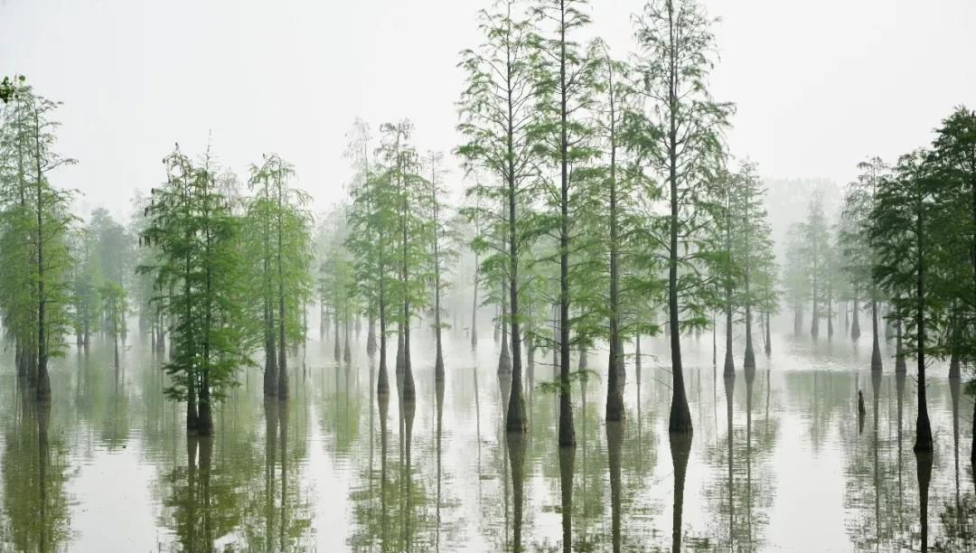 秋天的池杉湖,分布在千亩湖水中的五万多棵池杉开始褪色,针状的树叶从树梢到树干,渐次由绿转黄,再变红,像是天空上一个巨大的调色盘被打翻,整个十月,油墨将一大片的池杉林从上到下、从里到外,慢慢浸染开去,直至晚秋,层林尽染。
