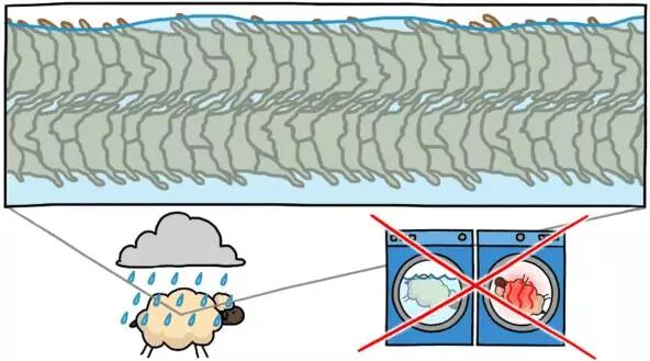 和所有的哺乳动物的毛发一样,羊毛的外层也被相互重叠、方向一致的毛鳞片包围着。这些鳞片让羊毛更容易往单一方向滑动。