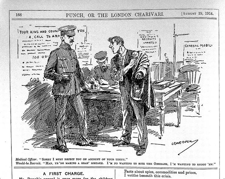 在这则《笨拙》的漫画中,军官说:“对不起,因为您的牙齿您无法参军。”应征者说:“您搞错了,我是去打德国人,又不是要去咬德国人。”图片来源:wikimedia