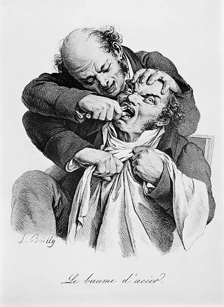 在20世纪之前甚至没有牙医这个行当,理发的托尼老师和打铁匠也会兼职拔牙,他们修理牙齿的方法就是用钳子使劲拽。当然了,这些三脚猫“牙医”并不比现在的牙医更便宜。