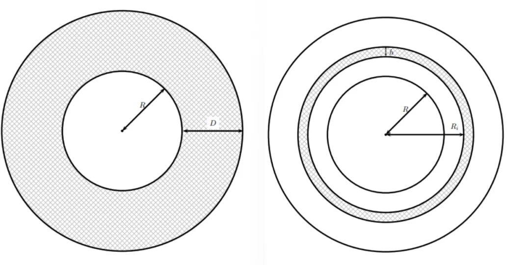 从最基础的开始算起,我们可以将卫生纸看作一个半径为R的纸筒,上面一共缠了n层纸,就可以看成是套了n层圆环。纸的总厚度为D。而一张纸的厚度为h。