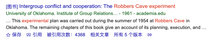 这个实验令Sherif相当满意,不久后他就将相关内容发表了出来。而罗伯斯山洞实验也成了现实冲突理论最为经典的例证之一,被奉为社会心理学实验中的圭臬,并在教科书和后来的研究论文中被频繁提及,目前的引用量超过了4千次。