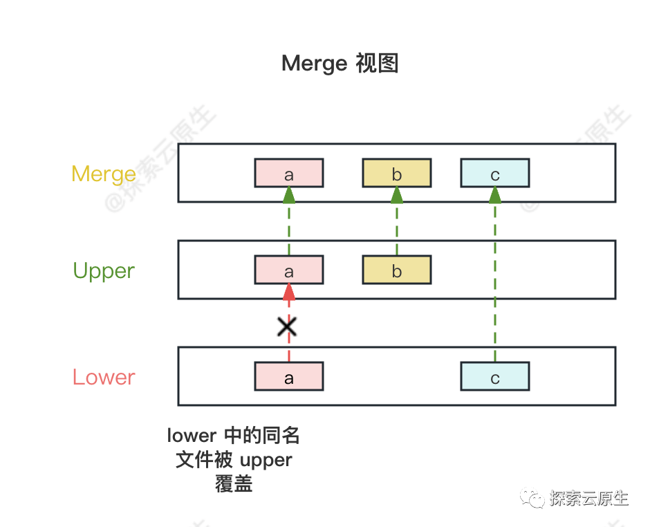 可以看到,merged 目录已经可以同时看到 lower 和 upper 中的文件了,而由于文件 a 同时存在于 lower 和 upper 中,因此 lower 中的被覆盖了,只显示了一个 a。