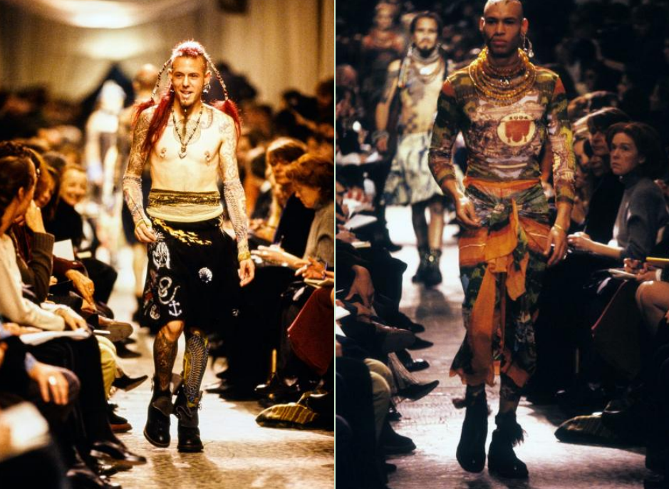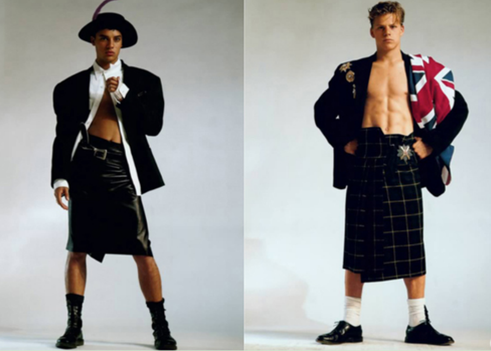 受到这种潮流的影响,以让-保罗-高缇耶(Jean Paul Gaultier)、高田贤三等人为代表的设计师将女性时尚元素融进男装中。1985年,高缇耶的“And God Created Man”男装发布会上,男模特们穿着裙子走T台。半身苏格兰裙、皮革裙、洛可可印花长裙等服饰挑战了男性的传统形象。许多法国媒体对此进行抨击,认为这是为男同性恋设计的衣服。高缇耶则认为服装不应被分别划分归属于某一性别,裙子也是男装的一部分。