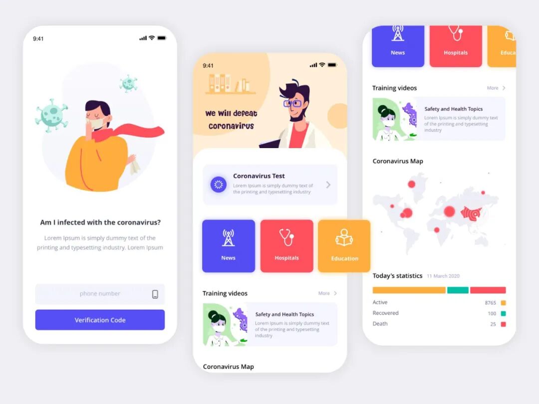 除了使用柔和的颜色,还可以在用户使用 APP 的不同阶段 推送鼓舞人心的消息、有趣的图片、欢快的语音 或其他元素。医疗保健类 APP 用户界面中的图像和图标,应始终带给用户 积极、愉悦的情绪,并 营造一种 无痛感 和 安全感。Mahdieh Khalili 设计的冠状病毒 APP9、区别于 Web 设计