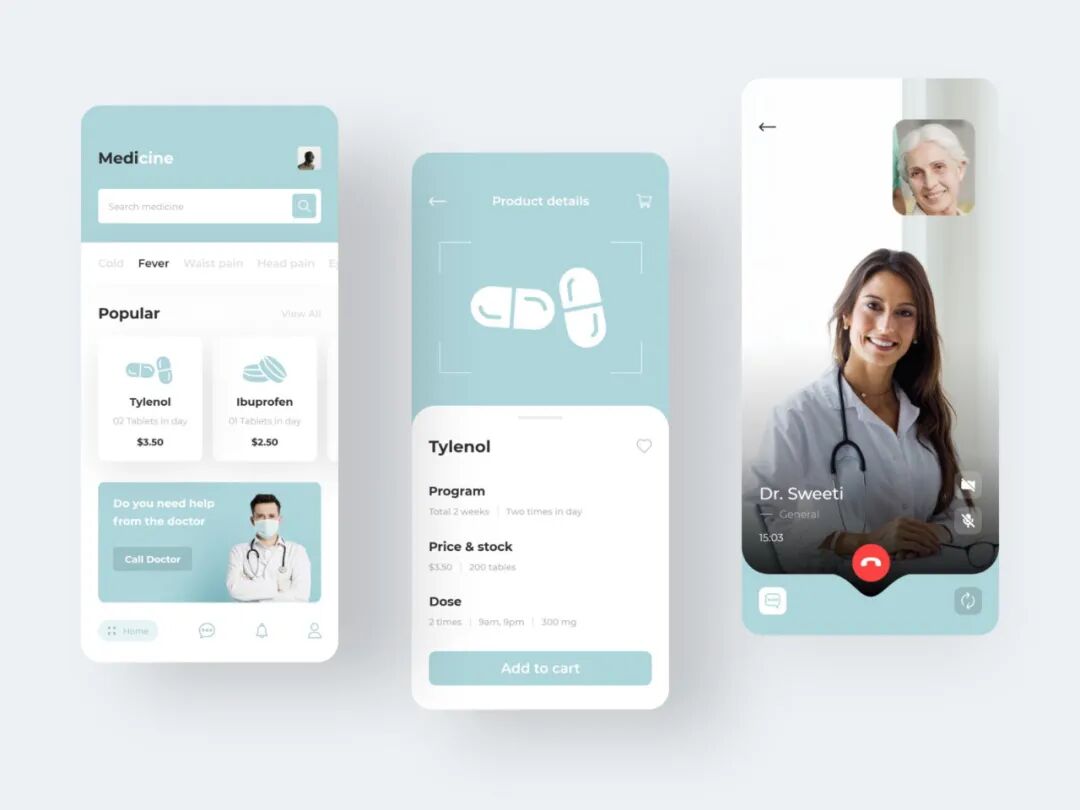 一般来说,APP 的颜色选择取决于 目标受众 以及 该 APP 的主题。医疗保健类 APP 设计通常采用 中性色调,尤其是 冷色调的蓝色和绿色,背景一般为 白色。设计师这样做是为了达到以下效果:利用柔和的色彩和医疗保健行业的联系,缓解用户焦虑并增加可信度。因此,在医疗保健类 APP 的用户界面中,亮红色或黄色是很少见的。 Adam Sokołowski 设计的医疗类 APP — Pharmagy 但是,考虑到医疗类软件的多功能性,颜色选择并没有特别的限制。主要思路是,这类 APP 的整体外观应 营造积极的印象,不应引起焦虑、恐惧或其他不良情绪。Saepul Rohman 的 UI 设计—健康及锻炼类 APP Michal Parulski 设计的移动健身 APP