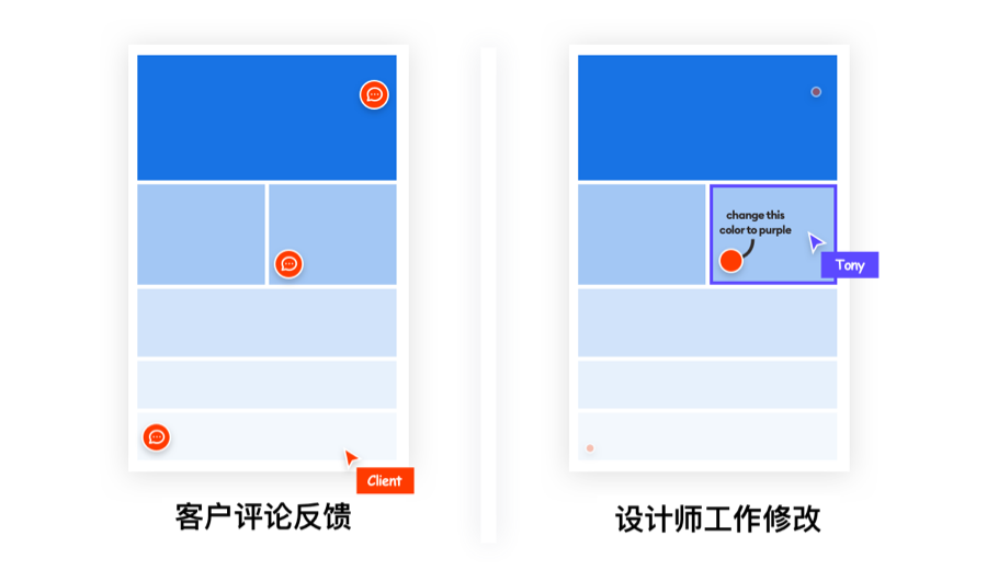 但是,当添加评论时看到设计师为 “在线编辑文件” 的状态时,会使客户或利益相关者不自觉开始进行微管理,并产生再次跟随光标的行为。添加评论的理想方法是 创建一种与协作分开的 “反馈” 模式。在这种模式下,你只能留下评论,但看不到任何人的光标。如果设计人员进行了一些更改,他们仍然可以实时在画板上进行更新,但是它使审阅者可以专注于评论,而不是查看忙碌的蜜蜂在移动的矩形。每个人在不同 “页面” 上完成的实际设计工作,而不是每个人都在同一画板上工作沟通问题
