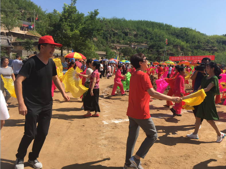 当天上午10点多,我陪同秋梅一家三口来到辛庄。车开到新填起的广场,车门打开,脚一着地,我已满眼泪花。我第一次踏上这块土地,这块土地几个月前还不曾存在,第一次踏上一条路,可以径直走到我出生和住过的窑洞,不需要再绕一个大湾。秋梅一家三口被现场的气氛所感染,也跟着秧歌队扭了起来。