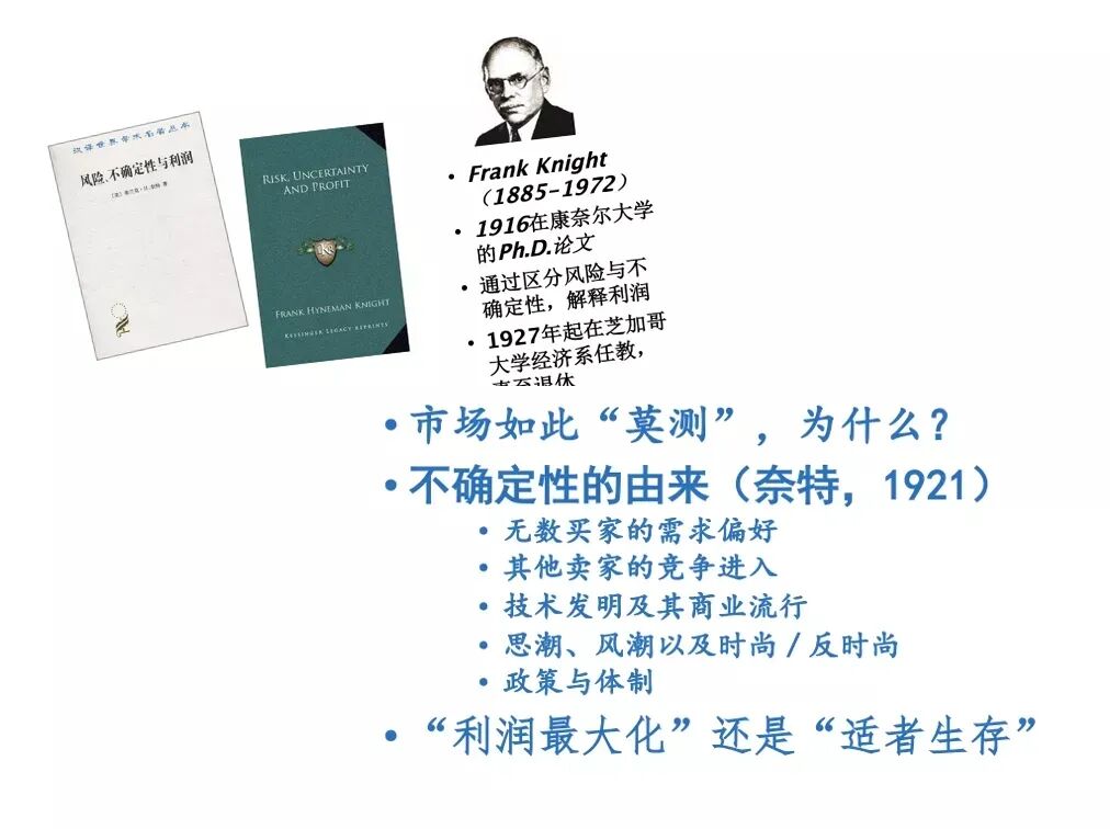 把这个问题讲清楚的,是弗兰克·奈特。顺便提一句,当年被认为是芝加哥大学经济系奠基人的这位奈特教授,毕生没有获得诺贝尔经济学奖的殊荣。不过,他教出来的学生当中,前后有六位获得诺奖。