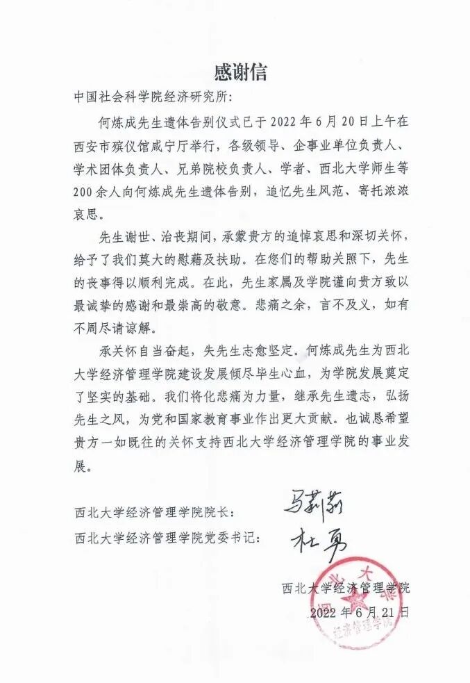 何炼成老师逝世的消息传来,经济所与西大经管学院的往来信函