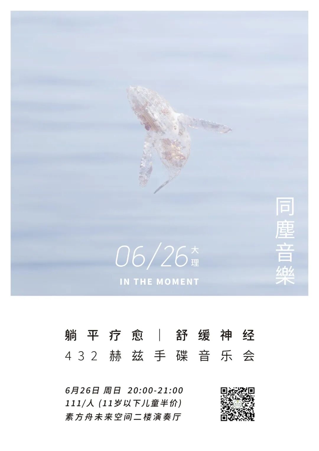 「时 间」 6月26日(周日) 20:00-21:00 「地 点」 素方舟未来空间 (二楼演奏厅) (大理市古城北门双狮路) 「门 票」 111元/人 (11岁以下儿童半价) 「购票联系」 请扫描下方二维码咨询报名 购票须知 1.门票一经售出恕不退换 (可转赠他人) 2.购票后请确认时间地点,为了更好的体验即兴音乐,务必准时入场 3.入场前请在大会议室签到 | 「演奏调式」 C Ashakiran 营造一种 阳光温暖充满情感 A minor 营造一种 远见|樱花|随和的感觉 温柔|信任 Eb La Sirena 营造一种 梦幻般的氛围 犹如美人鱼催眠的歌声 快乐|浪漫 D Mystic 营造一种 深邃的氛围 冥想|瑜伽 C# Pygmy 营造一种 浩瀚宁静的氛围 激发更深层次的情感 空灵|深情 |