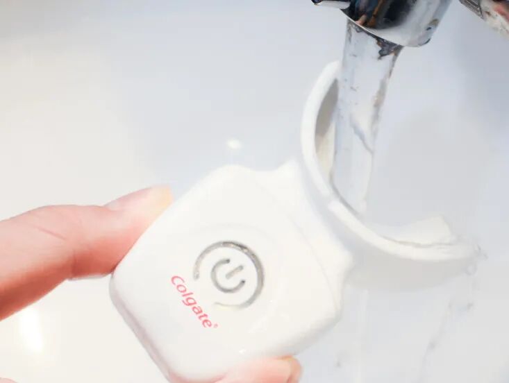 高露洁美牙仪的自重很轻,放在嘴巴里是没什么异物感的,玩会手机、泡个脚、敷个面膜的时间,它就可以完成任务了!
