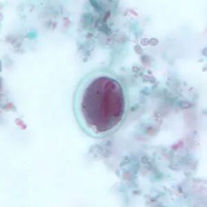 贾第虫是一种原虫类寄生虫其具有包囊和滋养体两种形态。包囊是贾第虫的感染形态,包囊被摄入机体后,在近端小肠脱囊形成滋养体。未附着于小肠的滋养体会移动到大肠,在此处转化为感染性包囊形式,这些包囊随粪便排出体外,从而再次回到环境中。这些包囊在粪便中传播并在食物或水中被吞食时感染新个体。