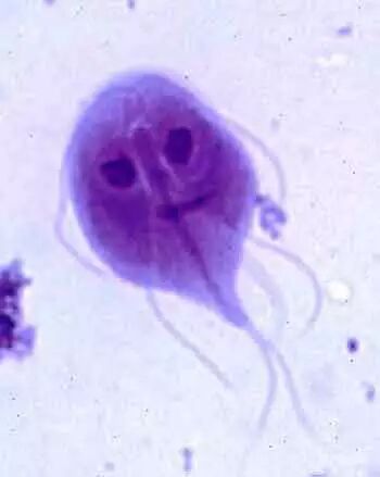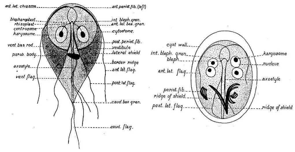 寄生虫通过腹侧粘性盘或吸盘附着于上皮细胞,并通过二元裂变进行复制。贾第虫病不会通过血液传播,也不会扩散到胃肠道的其他部位,只是局限于小肠腔。贾第虫滋养体从小肠腔吸收营养。如果病原体处于滋养体的分裂期,进行吉姆萨染色染色,其特征图案就呈现出神秘的“微笑”符号。