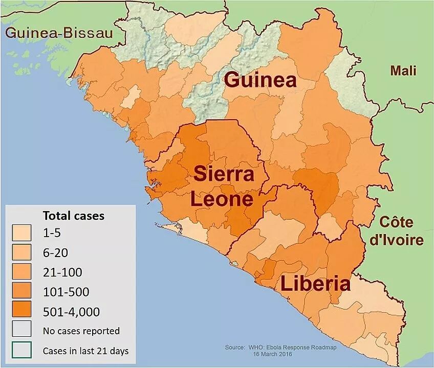 2014年3月,世界卫生组织(WHO)报告在西非国家几内亚暴发了一次重大埃博拉疫情。研究人员将此次疫情追溯至一名2013年12月死亡的一岁大孩子。该病迅速传播到利比里亚和塞拉利昂的邻国。这是有史以来最大的埃博拉疫情暴发,也是该地区首次记录。