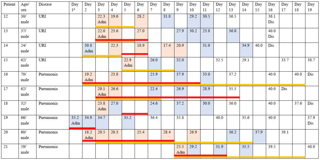 研究共纳入21个患者,患者的中位年龄62岁,76%为男性。在纳入的所有患者中,71%的患者出现了肺炎,38%的患者接受了吸氧治疗。中位序贯器官衰竭估计(Sequential Organ Failure Assessment, SOFA)评分为0(SOFA评分范围0~24,评分越高,多器官衰竭程度越重,死亡的风险越高),中位急性生理学和慢性健康状况(APACHE)II评分5分(范围0~71,评分越高,出现重症化和死亡的风险越高),上述评分的结果提示纳入这项研究的患者均为轻中症感染。所有患者间隔1~5天(中位时间:2天)接受新冠核酸RT-PCR检测,共采集了165个样本。每个患者病程中不同时间点病毒定量的动态变化见下图。