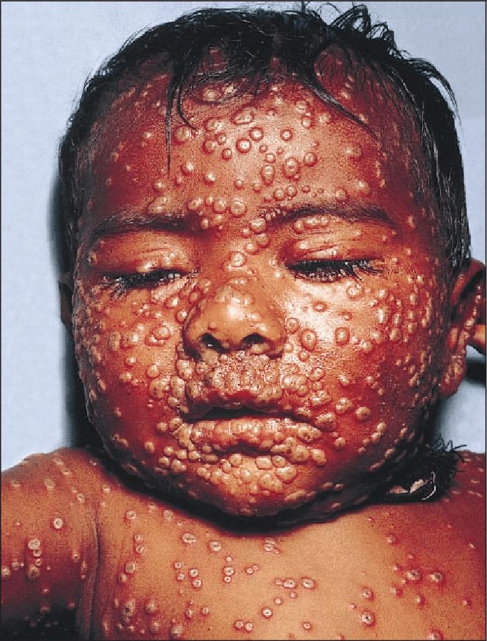 天花最常见的特征是突然发高烧,剧烈头痛,腰酸和不适。然后,在出现这些症状后,在粘膜上开始出现病变(粘膜疹),随后出现皮疹,涉及面部、近端四肢、躯干和远端四肢。死亡风险与皮疹的严重程度密切相关。