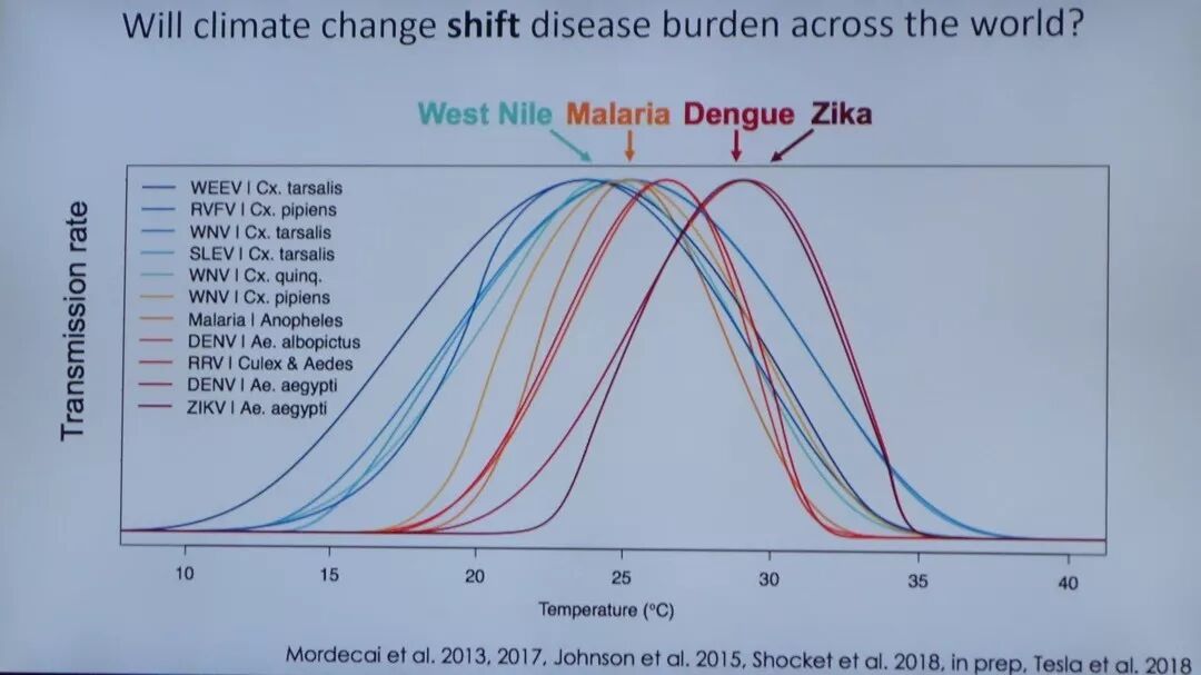 此图提示,适宜传播的温度来看西尼罗病毒温度最低,疟疾居中,登革热和寨卡病毒病的温度最高。
