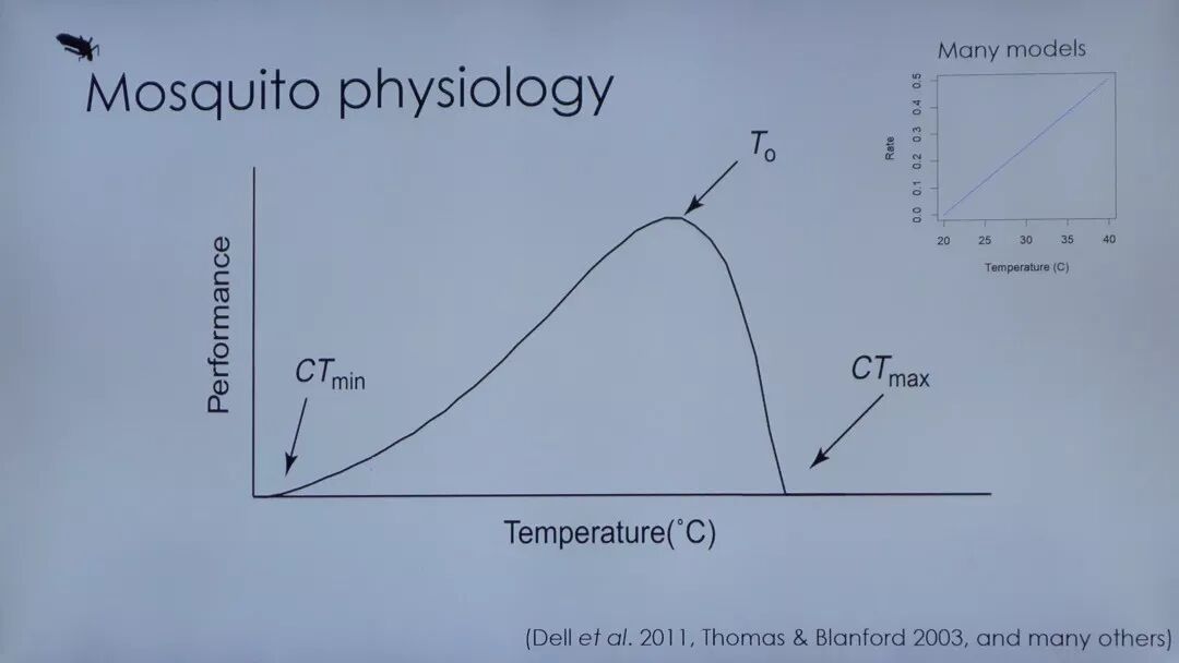 与按蚊传播的疟疾相反的是由埃及伊蚊和白纹伊蚊传播的登革热、基孔肯雅热和寨卡病毒病。首先埃及伊蚊主要在热带地区分布,而白纹伊蚊更主要分布在气温稍低的亚热带地区。也就是说白纹伊蚊和埃及伊蚊在相同温度下R0是不一样的。白纹伊蚊的温度相对较低。