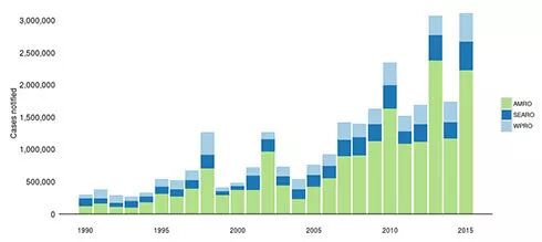 世卫组织的三个区域的成员国定期报告每年的病例数。报告的病例从2010年的220万例增加到2016年的334万起以上。虽然这种疾病的完整的全球负担尚不确定, 但报告的病例数在一定程度上解释了近年来报告的病例急剧增加的原因。