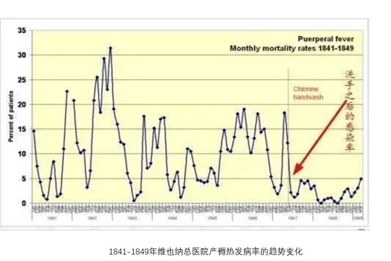维也纳总医院产褥热暴发流行,新分娩孕妇的死亡率居高不下。助理医师塞梅尔维斯(Ignaz Semmelweis)在调查中发现在产科医师和医学生接生中,产妇病死率为8.3%,而助产士接生中,产妇病死率仅为2%。