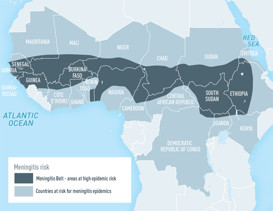 非洲脑膜炎带是撒哈拉以南非洲的一个地区,那里的脑膜炎发病率很高。它由(从西到东),冈比亚,塞内加尔,几内亚比绍,几内亚,马里,布基纳法索,加纳,尼日尔,尼日利亚,喀麦隆,乍得,中非共和国,苏丹,南苏丹,乌干达,肯尼亚,埃塞俄比亚,厄立特里亚。