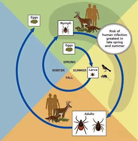 感染的若虫将在春季末期或初夏的吸食血液的过程中将病原体传播到第二个宿主(例如,老鼠,田鼠,花栗鼠)。然后,该宿主将生物体传播到后代的幼虫,以完成水平传播周期。一旦吸食血液,蜱虫就会掉下宿主,并在秋天蜕化为成虫。