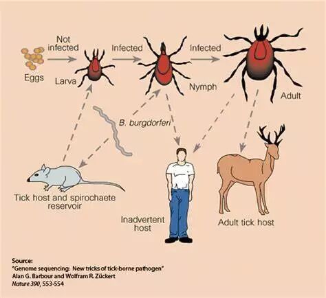鹿对于传播莱姆病的蜱虫的生存至关重要但并不适合螺旋体的生长。肩突硬蜱成虫不会寄生在啮齿动物那样较小的宿主上,而是在较大的动物上寄生吸食血液,尤其是鹿。尽管肩突硬蜱的公认通用名是黑脚蜱,但在许多地方俗称鹿蜱。但实际上,鹿的补体似乎可以溶解伯氏疏螺旋体,因此鹿体内检测不到螺旋体。莱姆病的临床表现通常可分为三个阶段:早期局部,早期播散性和晚期疾病。早期疾病包括游走性红斑(EM)和类似于病毒综合征的非特异性发现。EM发生在大约80%的患者中,通常在蜱虫叮咬后的一个月内。伴有急性神经系统或心脏疾病的早期传播的莱姆病通常发生在蜱虫叮咬后数周至数月,也可能是莱姆病的首发表现。居住在或近期去过莱姆病流行地区的患者,如果出现特征性游走性红斑(EM)病变,则可以仅根据临床表现做出早期莱姆病的诊断。因为出现特征性EM时,还未发生有诊断价值的适应性免疫应答,所以存在特征性EM损害的患者极可能为血清反应阴性。不需要进行实验室检测,也不推荐进行。 应对满足以下所有标准的患者进行血清学检测:近期有莱姆病流行地区居留史或旅行史且存在接触蜱虫的危险因素且症状符合早期播散性疾病或晚期莱姆病,例如脑膜炎、神经根病、单神经炎、颅神经麻痹、关节炎、心脏炎。