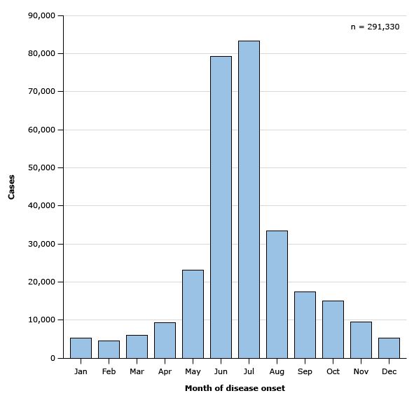 2007年至2016年,美国共报告确诊的262,481例莱姆病病例。2016年,该疾病是第六大最常见的可报告疾病。在对16种可报告媒介传播疾病的国家监测数据进行的分析中,莱姆病占2004年至2016年报告的所有媒介传播疾病病例(例如蚊子或蜱虫传播的病例)的63%,占报告总数的82%传播感染。