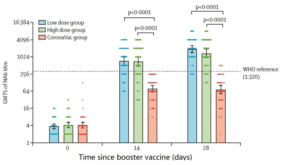 图2 三组受试者接种后不同时间点中和抗体的几何平均滴度。