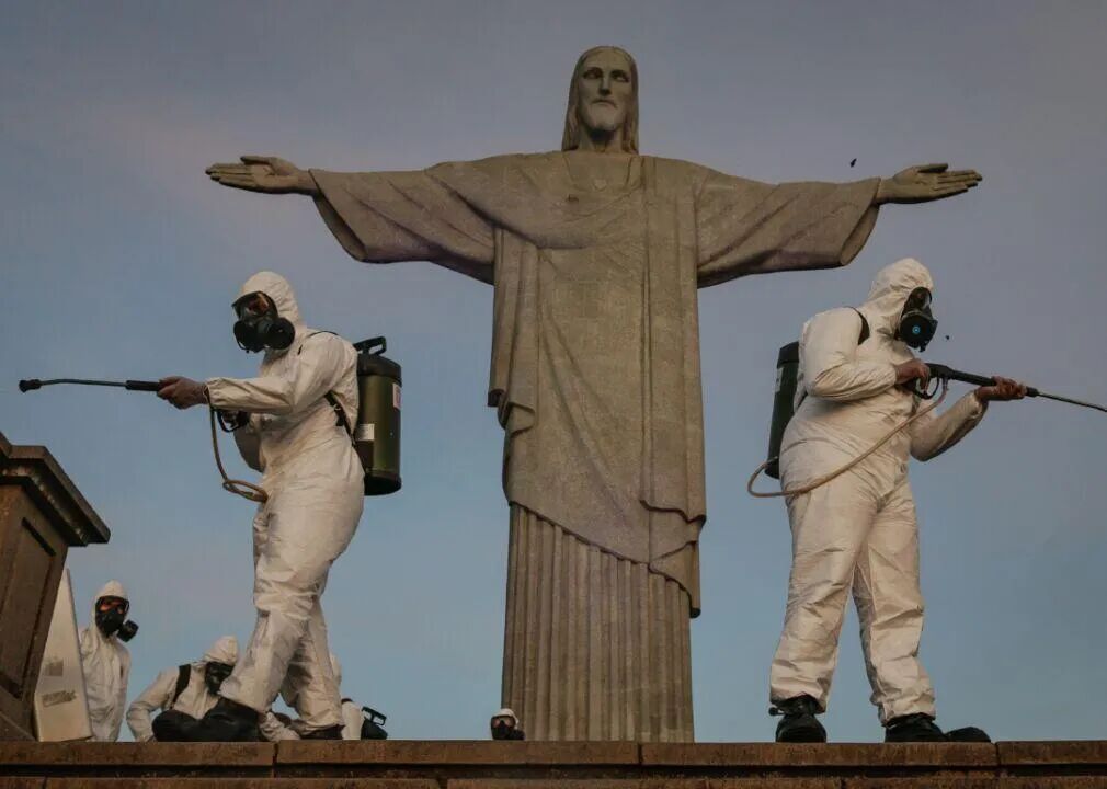 2020年8月13日,在巴西里约热内卢,疫情联合指挥部的军事人员对救世主基督雕像所在的圣殿进行消毒。