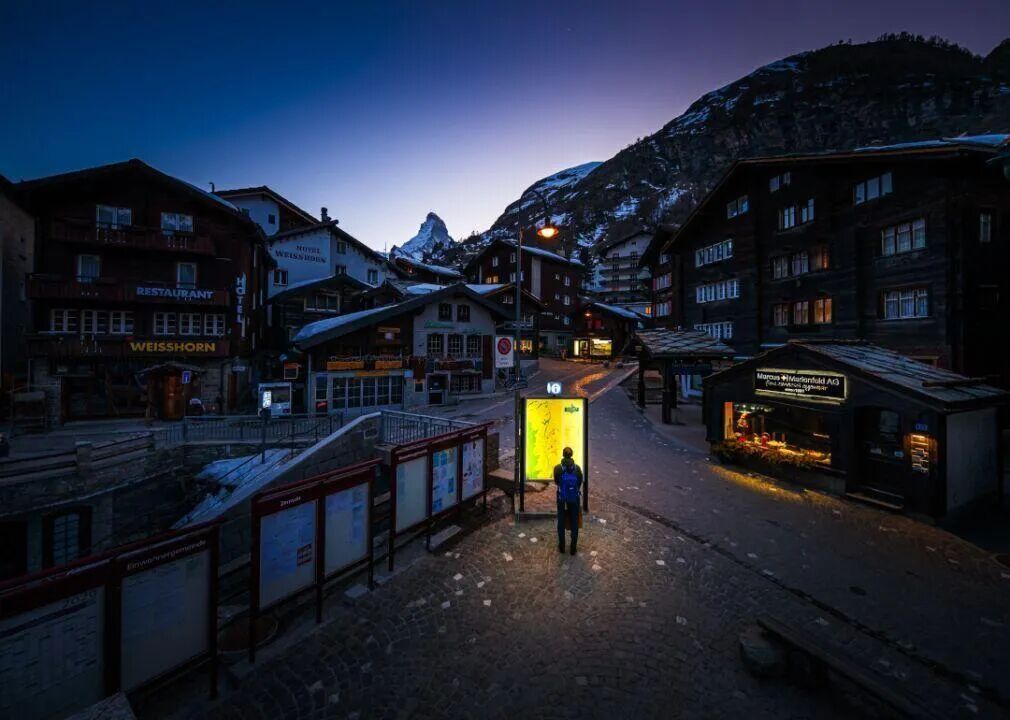 这张孤寂的照片拍摄于2020年3月18日的阿尔卑斯山,空旷无人的街道,只有一个行人正在望着一块发光的地图板,远处的马特洪峰清晰可见。