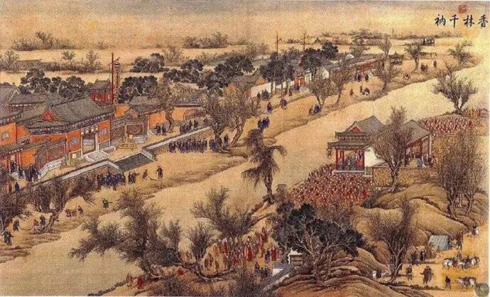 乾隆二十六年,万寿寺作为其为母祝寿的重要场所,进行了重修,新盖了八角攒尖顶黄琉璃瓦碑亭,这是万寿寺内首次出现黄琉璃瓦建筑。此时的万寿寺集寺院、行宫、园林为一体,规模空前。崇庆皇太后七十寿辰之际,寺院僧众和官员们寺前迎接的情景被宫廷画师描绘于图上,名为《香林千衲》。![]()