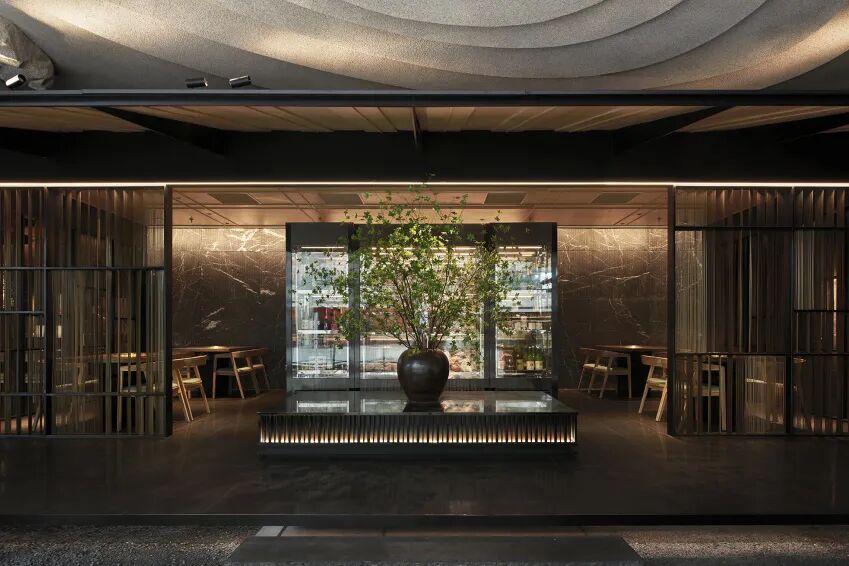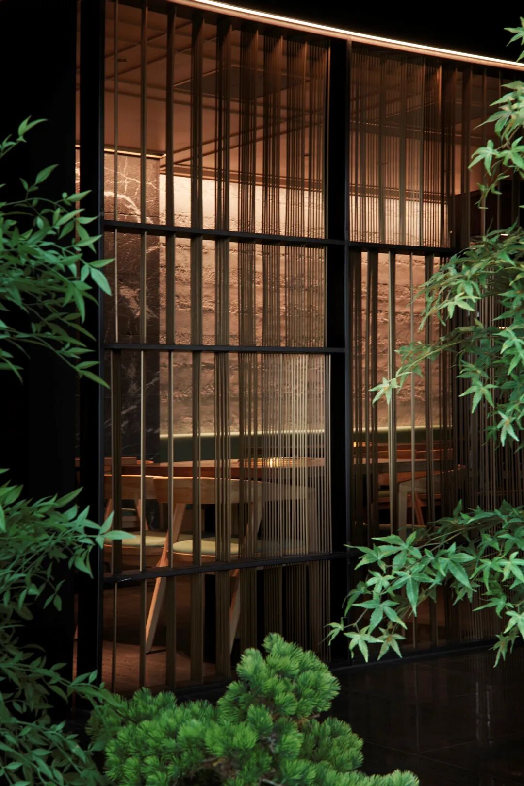 多次入围AD100的odd设计事务所的最新作品,是一家位于上海黄金地段的日式餐厅——大無烧肉。餐厅的设计灵感源于日本传统建筑中的“軒下空間”概念和中式园林造景技艺,以此在都市的纷攘氛围中创造一隅兼具传统风格和现代元素的独特用餐空间。餐厅入口采用开放式设计,与层次丰富的“L”型的连排屋檐相互交织配合,赋予了餐厅“室内,室外,半室外”这样的多元空间形态。庭院内,设计师用高挑的屋檐作为园林景观与用餐空间的分割,在保证用餐体验的前提下,也给予了空间开放性。