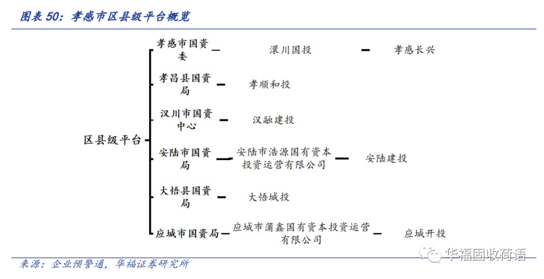 孝感市有区县级平台6家:孝昌县顺和开发投资有限责任公司(简称“孝顺和投”)、汉川市汉融投资建设开发有限公司(简称“汉融建投”)、孝感市长兴投资有限公司(简称“孝感长兴”)、安陆市建设开发投资有限公司(简称“安陆建投”)、大悟县城市建设投资开发有限责任公司(简称“大悟城投”)、应城市蒲阳开发投资有限公司(简称“应城开投”)。