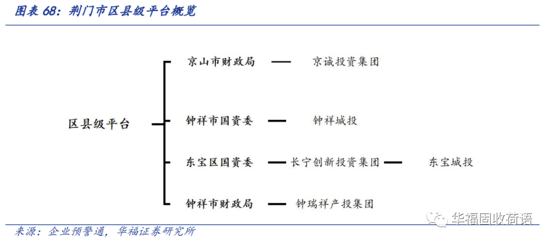 荆门市有区县级平台4家:京山市京诚投资开发集团有限公司(简称“京诚投资集团”)、钟祥市城市建设投资公司(简称“钟祥城投”)、荆门市东宝区城乡建设投资有限公司(简称“东宝城投”)、湖北钟瑞祥产业投资集团有限公司(简称“钟瑞祥产投集团”)。