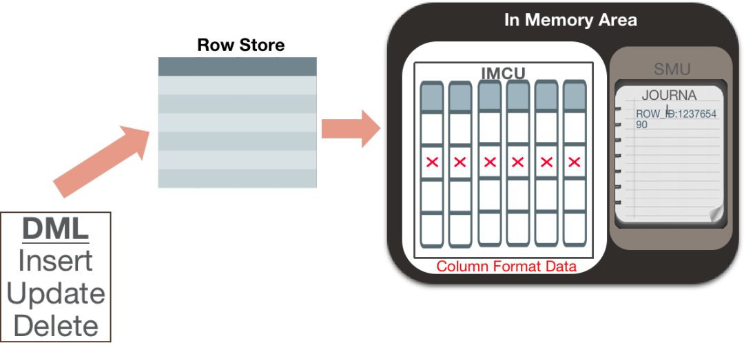 所有的数据的DML操作, 为了保证数据的完整性和一致性, 都是先通过行式处理进行保存, 保存完毕之后, 再同步到in memory 区域。而在in-memory中的数据是由两部分组成, 第一部分是列式存储IMCU, 另外一部分记录最新数据变化的SMU。