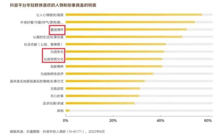 短视频平台上,“家国情怀”“弘扬传统文化”的人物形象,也受大部分年轻人的欢迎。/巨量算数《2022抖音年轻人观察报告》学养生功、太极、八段锦等传统武术的人越来越多,这些与天地和谐共鸣的动作,似乎真的是刻在中国人的DNA里。最近热播的动漫《中国奇谭》,没有科幻特效的渲染,只有一个个关于神话、聊斋、精怪的乡土故事,却最能戳中国人的审美意趣。而近年来穿汉服、养花鸟、听戏曲、盘文玩等小众爱好,也通过互联网的发展传播,自成一番文化意趣。