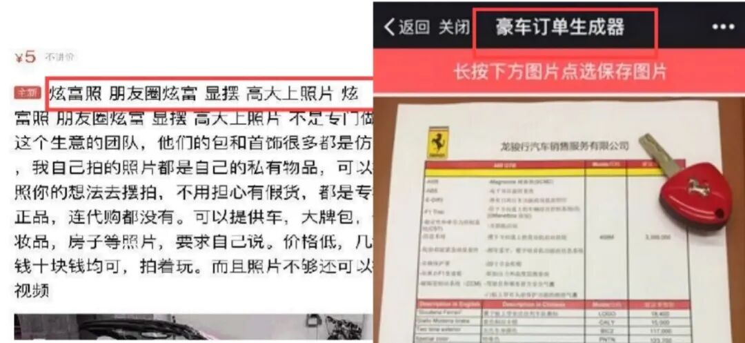 “定制炫富照,可提供车、大牌包、化妆品、房子等照片,最低只要一块钱!”