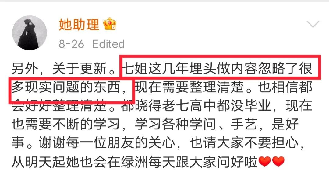 面对被一再激起的舆论场,8月26日,李子柒的助理在微博对于“更新”问题解释道:七姐这几年埋头做内容,忽略了很多现实的问题,现在需要整理清楚。