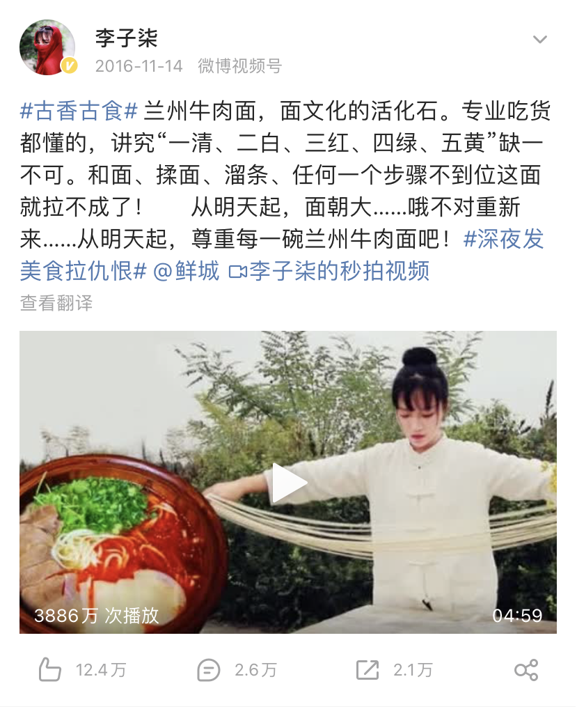 2016年,李子柒的一则《兰州牛肉面》视频,引爆网络,在全网获得了5000万播放和超60万点赞。